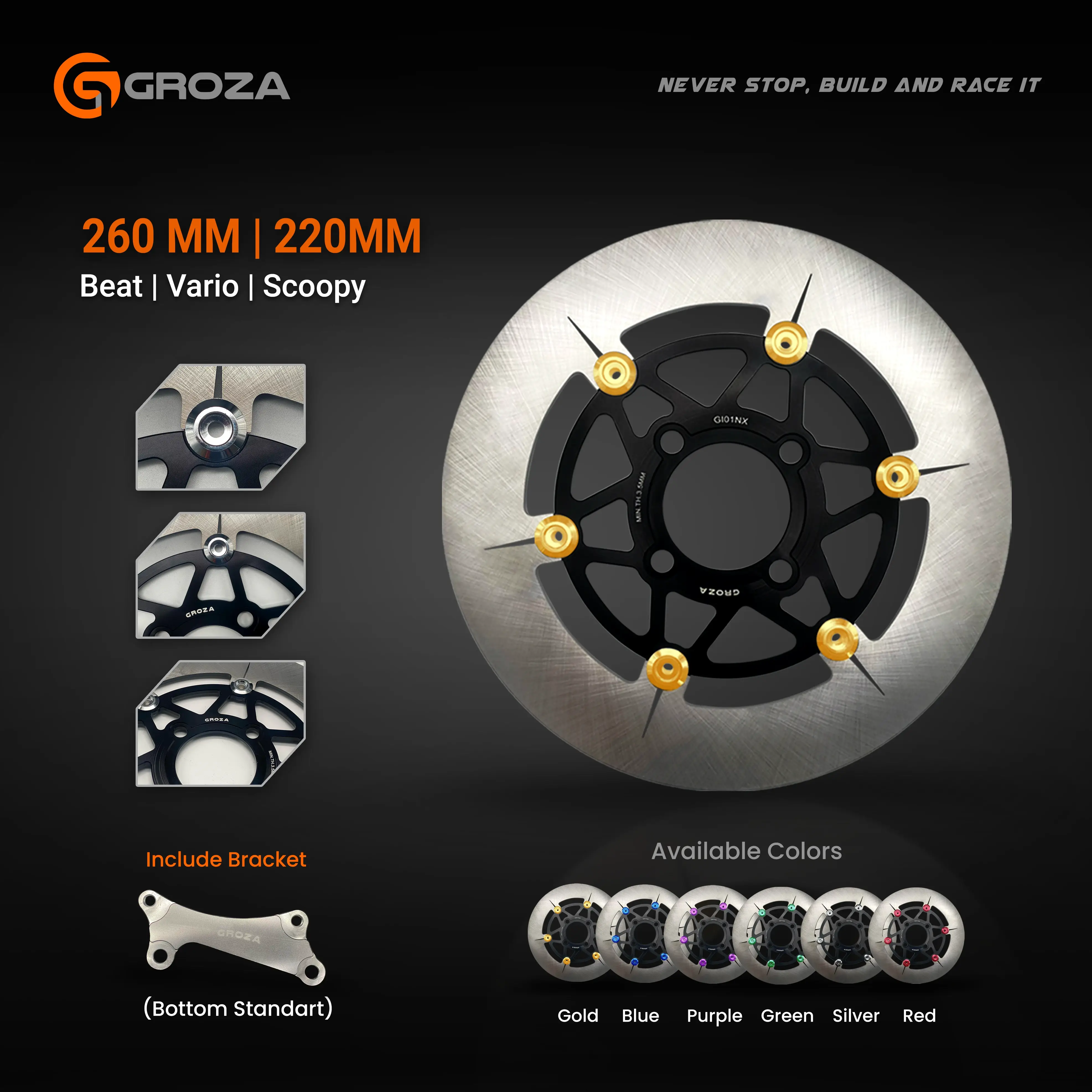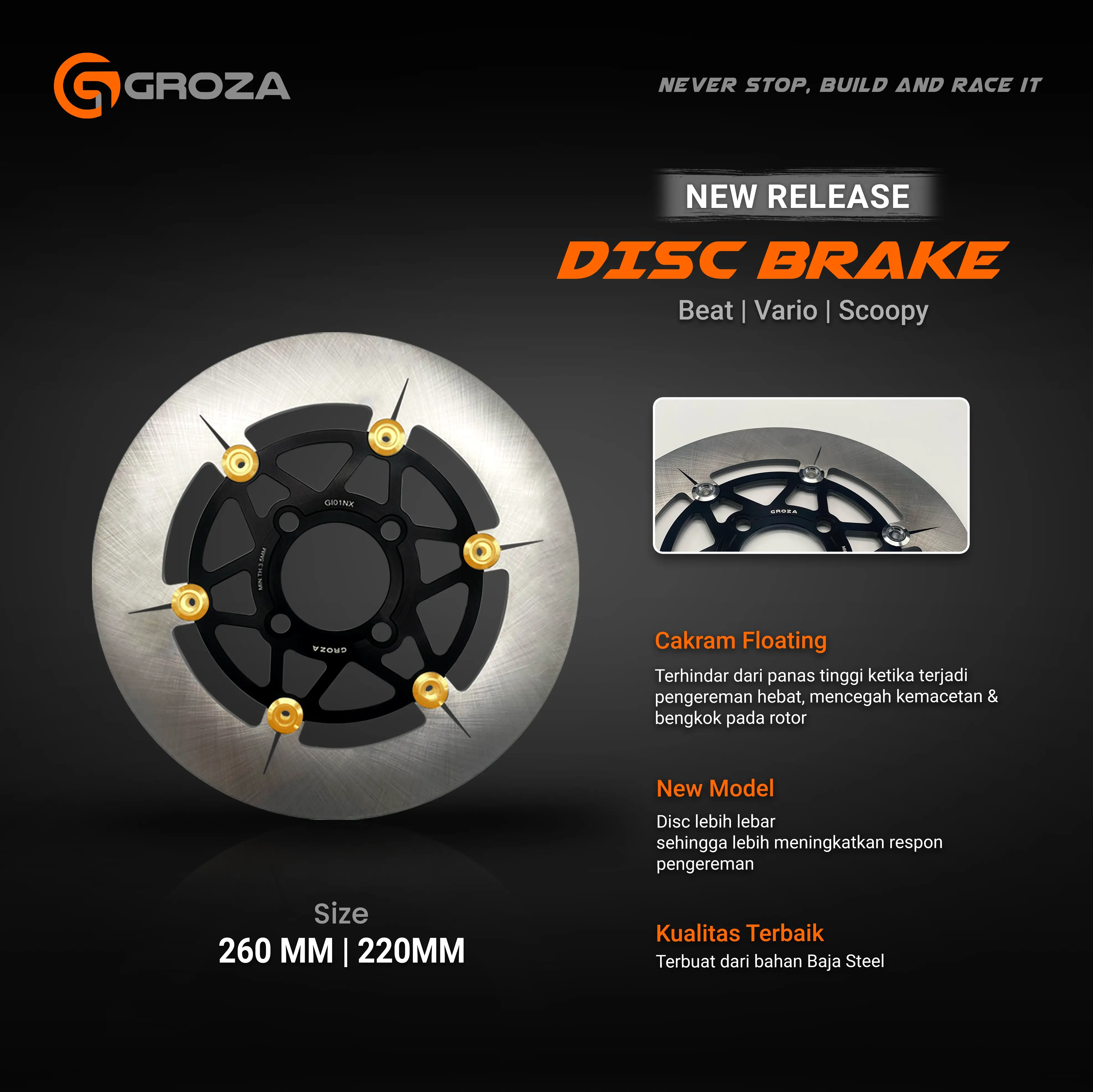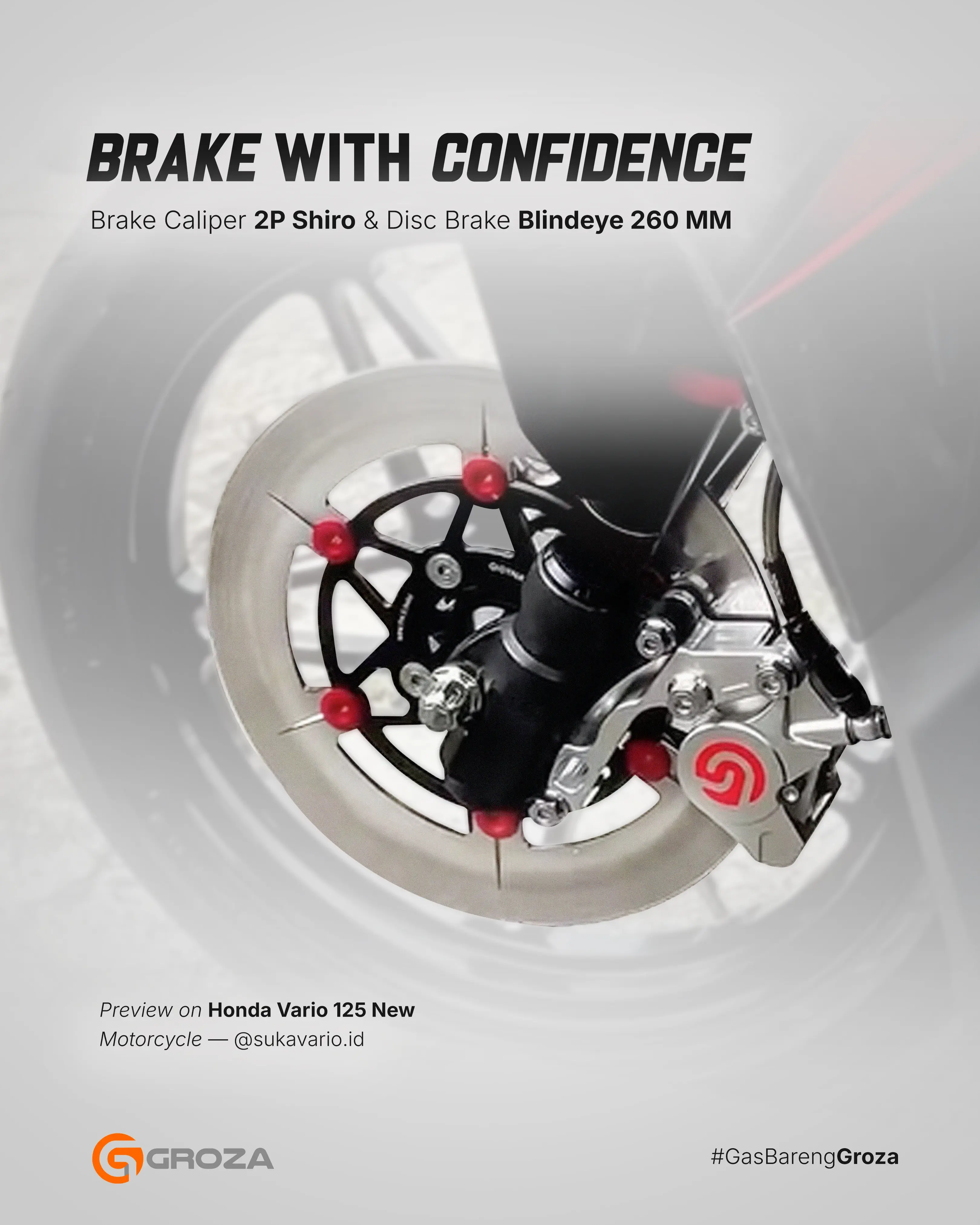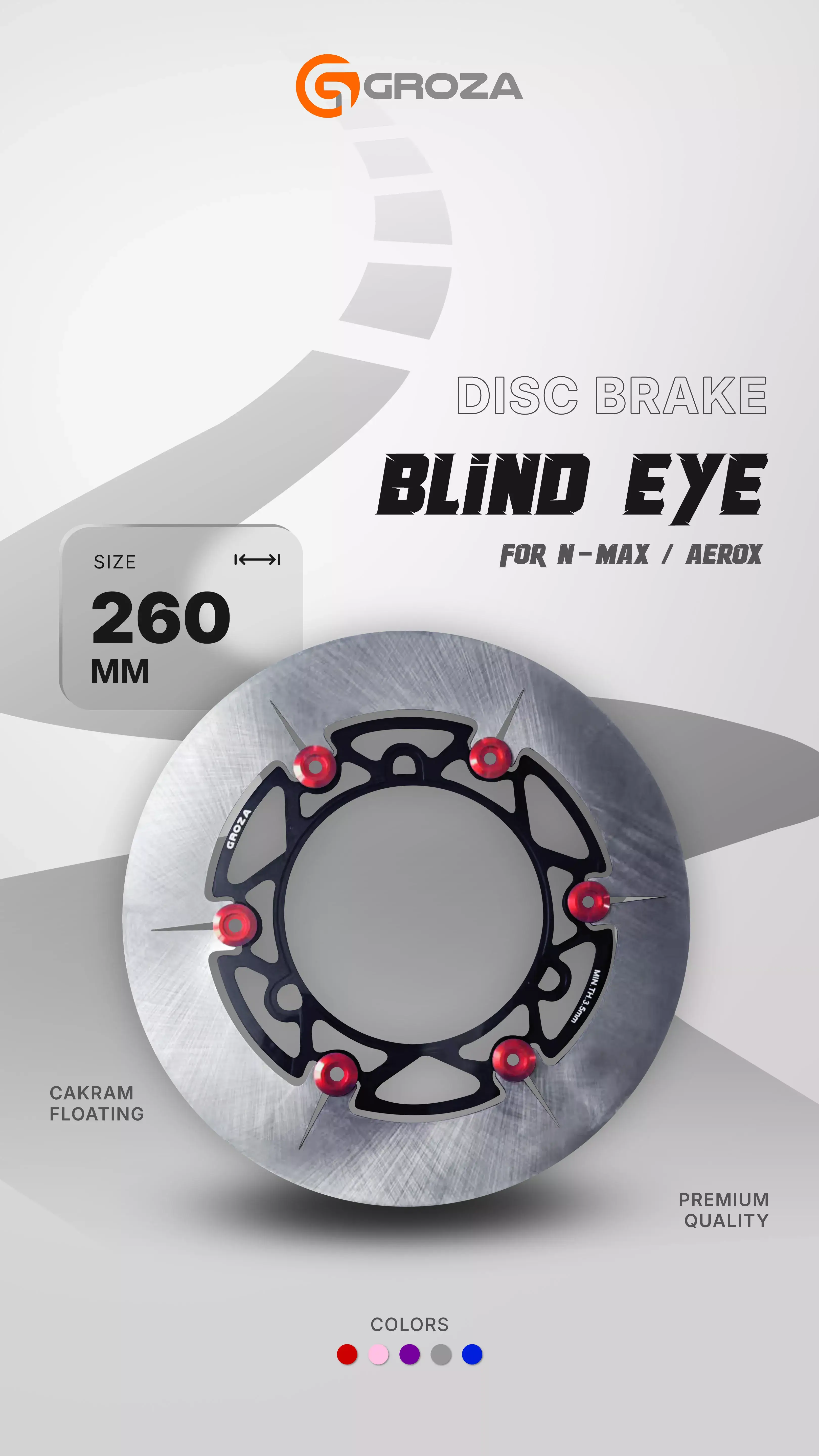 Disc Brake Blindeye tampil beda, dengan desain tanpa lubang. Namun, dengan bahan baja steel, desain floating, dan ukurannya yang lebar, siap memberikan performa pengereman yang tetap konsisten, stabil, dan halus, tanpa mengurangi sedikitpun performa pengeremannya. Disc Brake Blindeye memiliki 2 opsi ukuran, yaitu 220mm dan 260mm, dan bisa digunakan untuk Honda Vario, Beat, Scoopy, dan Yamaha NMAX, Aerox.