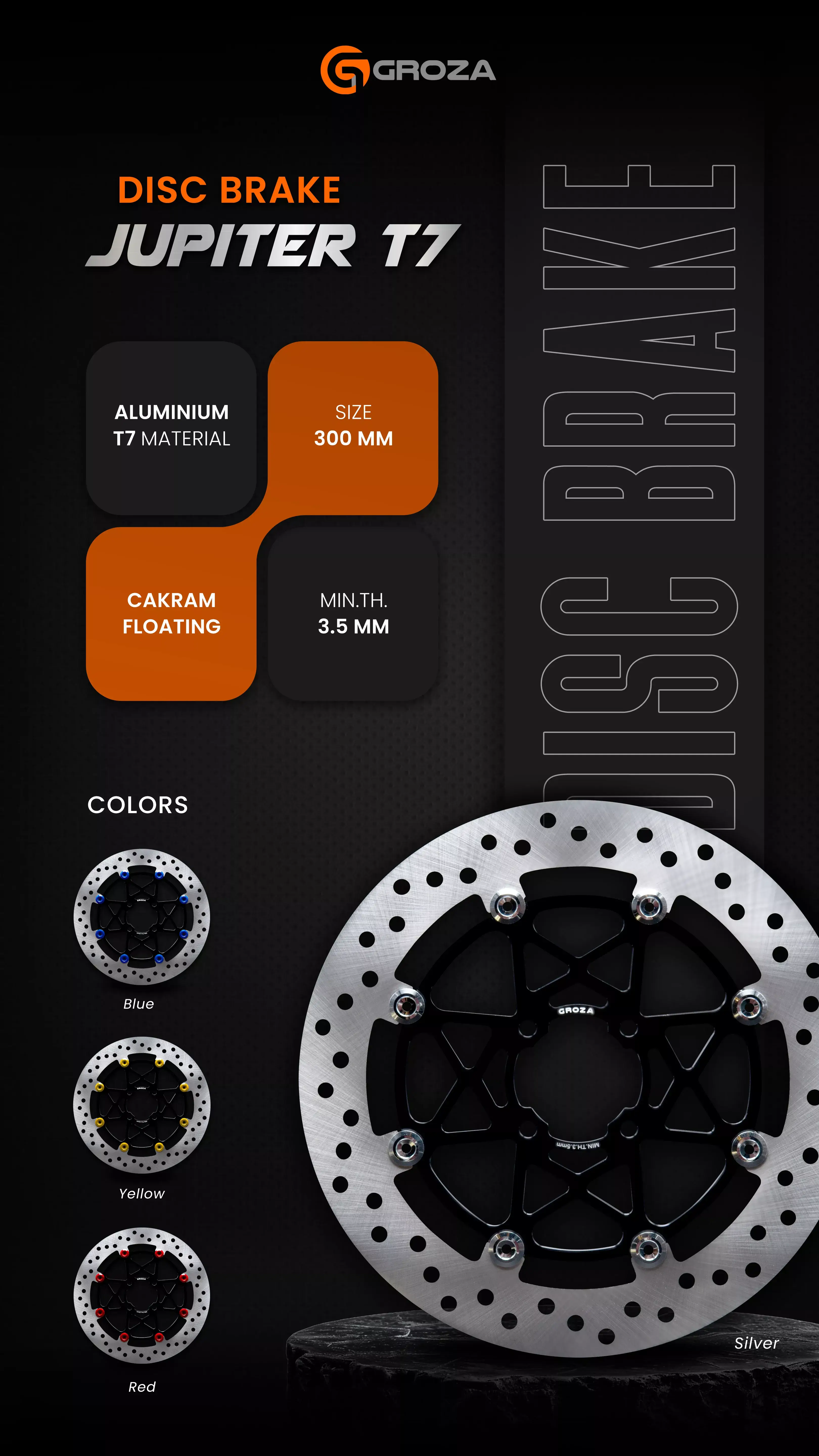 Disc Brake Jupiter dari Groza bisa jadi jawaban untuk solusi pengereman kamu! dengan Material Aluminium T7, dan Ukuran Lebar hingga 300mm menghasilkan performa pengereman yang konsisten, stabil, dan presisi!