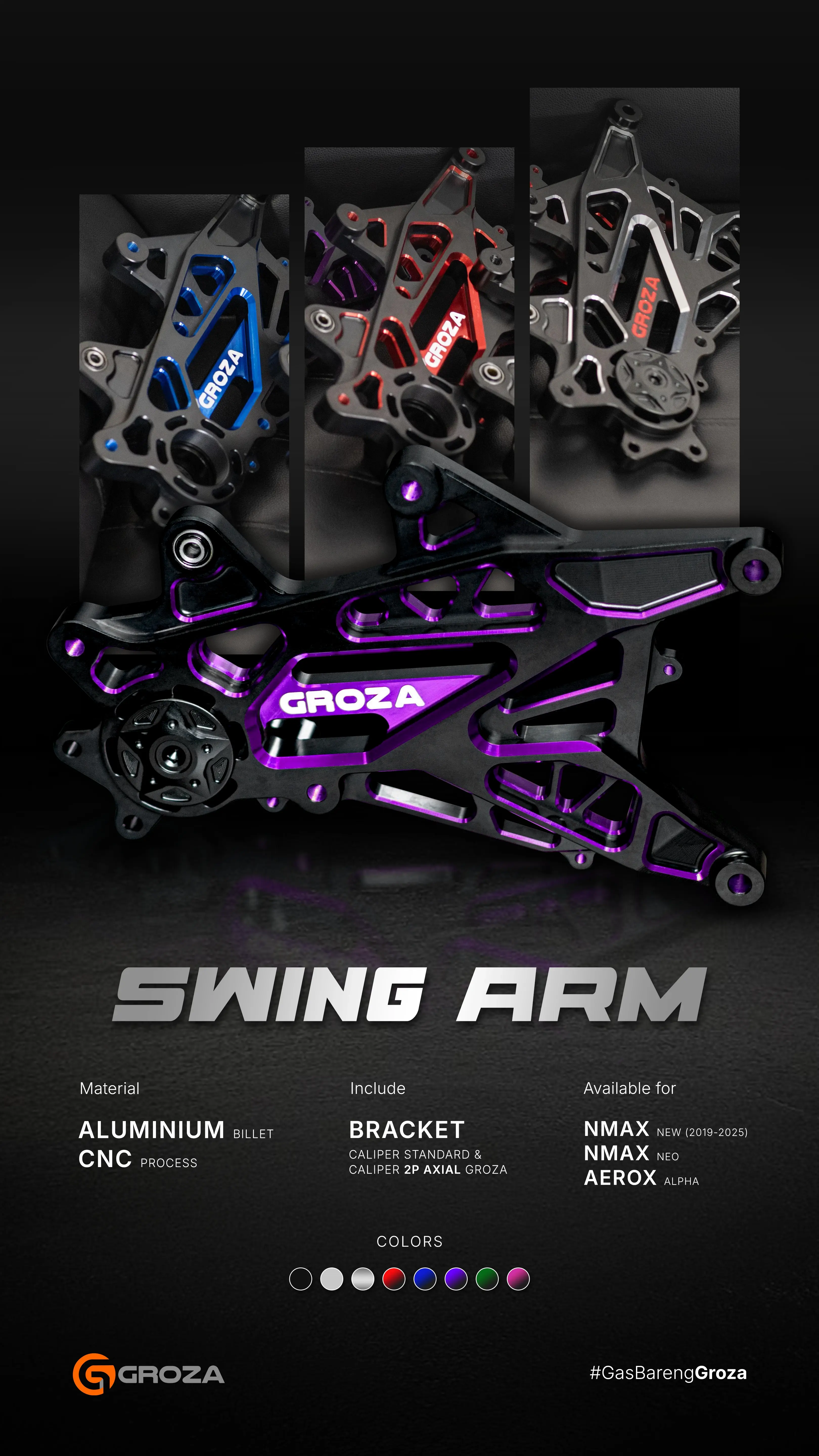 Get Ready to Improve Performance and Maximize Looks! Swing Arm Groza bisa jadi jawaban terbaik jika kamu mau upgrade penampilan NMAX Neo, NMAX New, atau Aerox Alpha kamu dengan Swing Arm dari Groza!