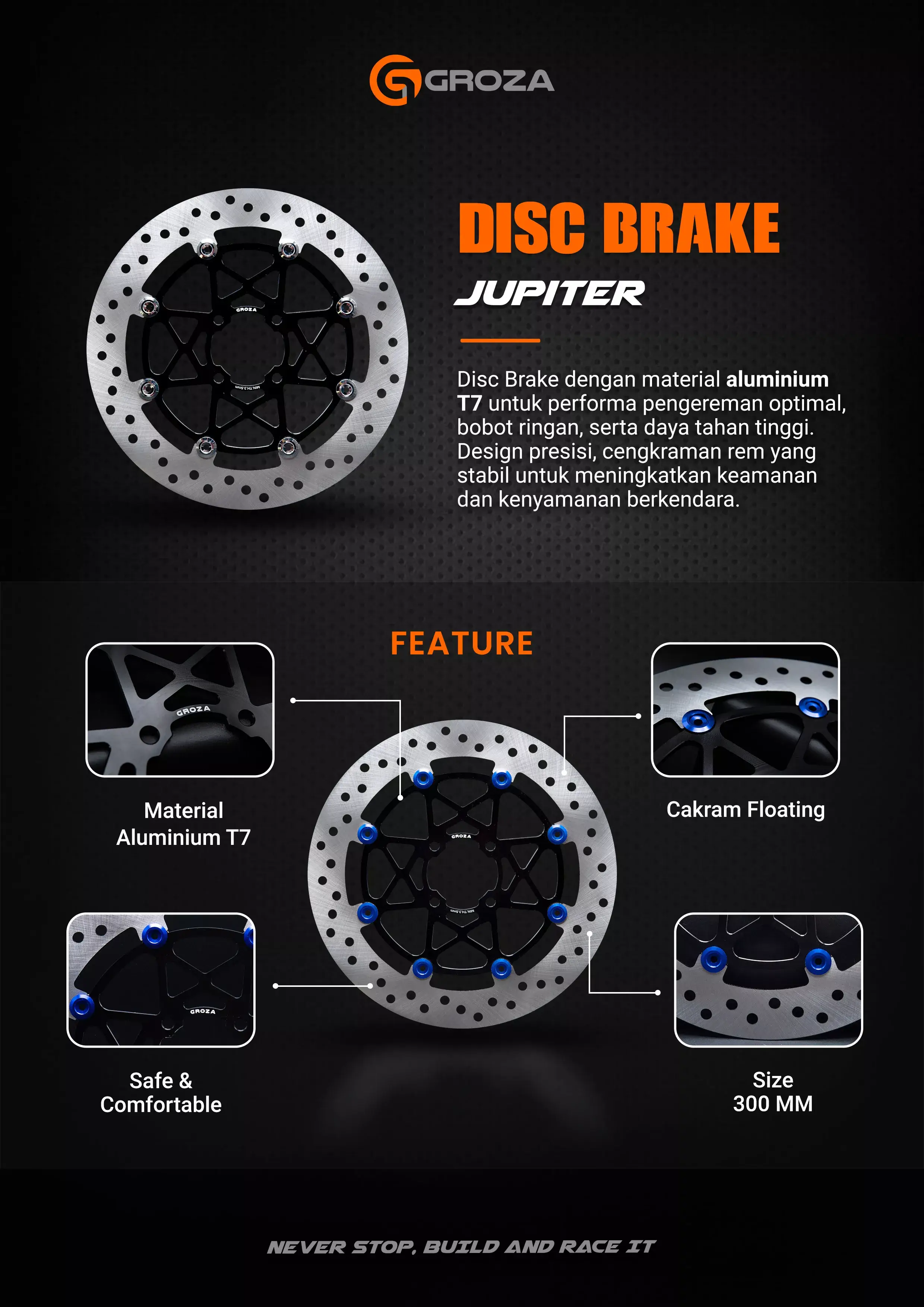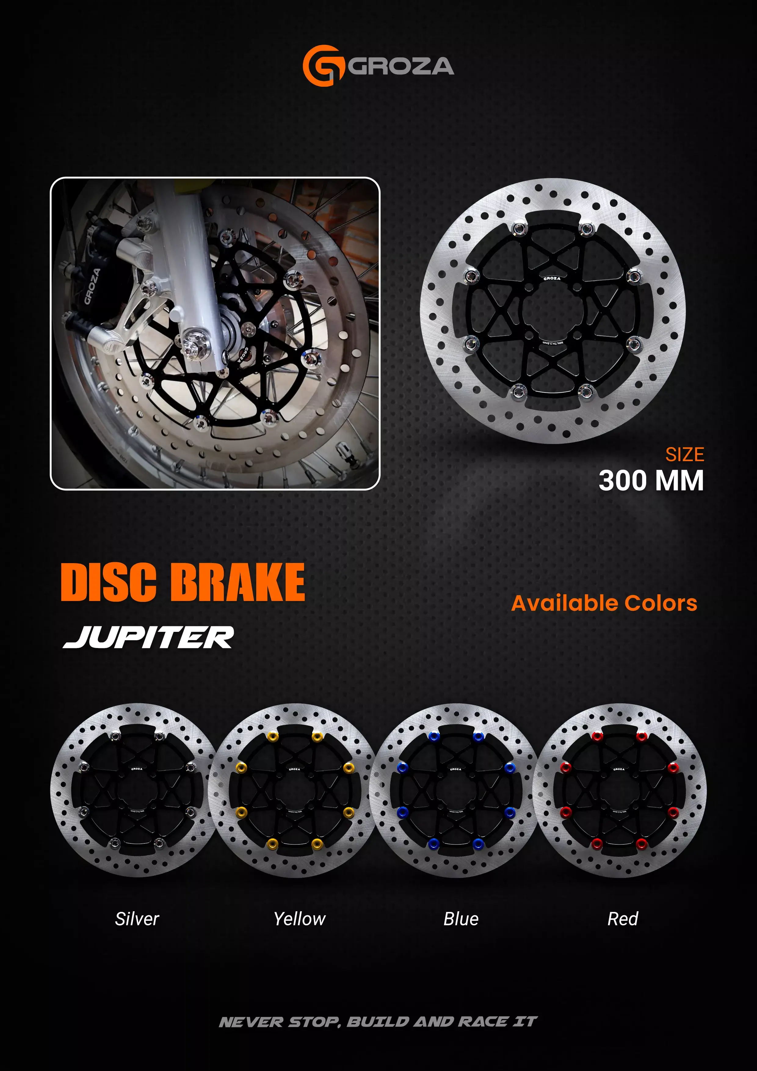 Disc Brake Jupiter dari Groza bisa jadi jawaban untuk solusi pengereman kamu! dengan Material Aluminium T7, dan Ukuran Lebar hingga 300mm menghasilkan performa pengereman yang konsisten, stabil, dan presisi!