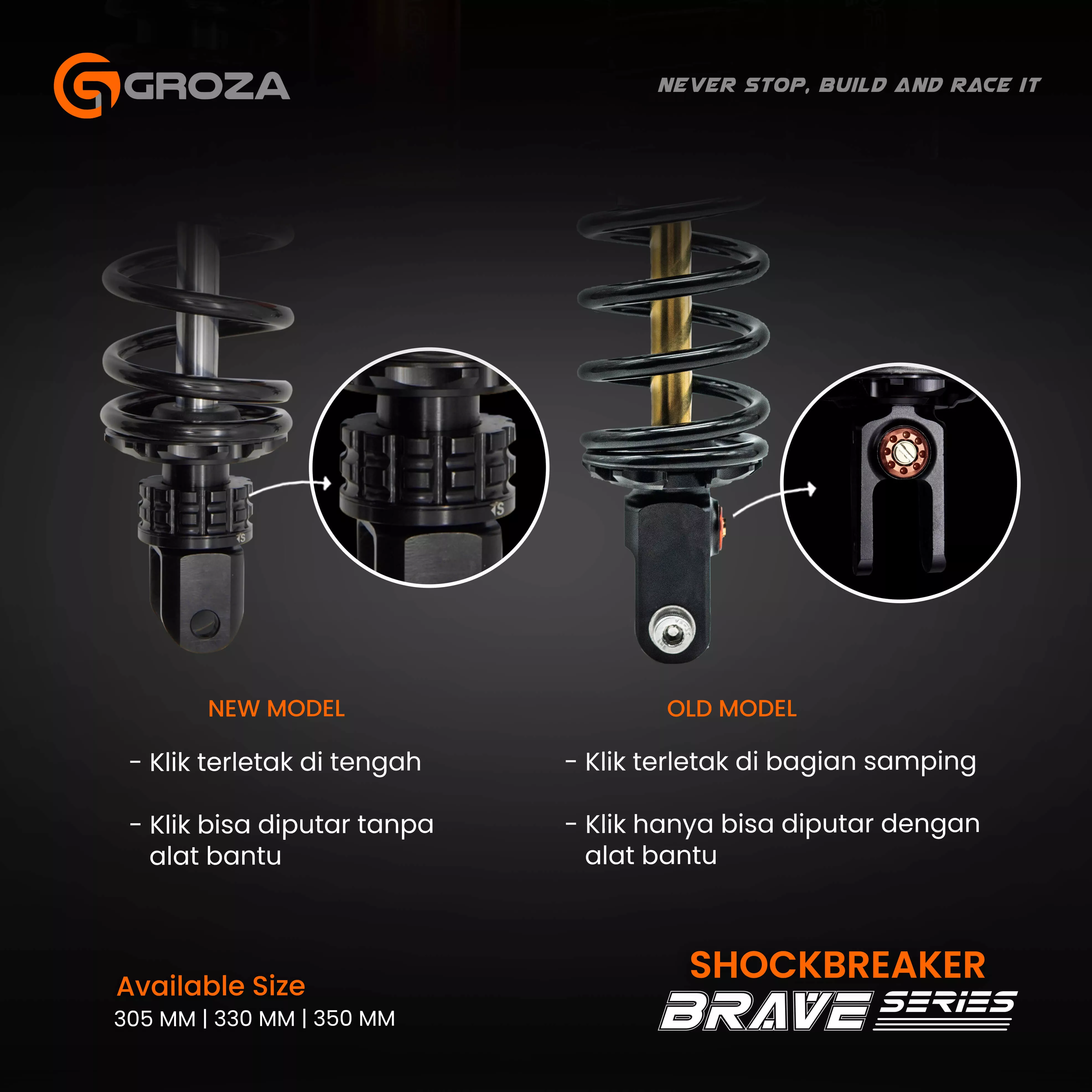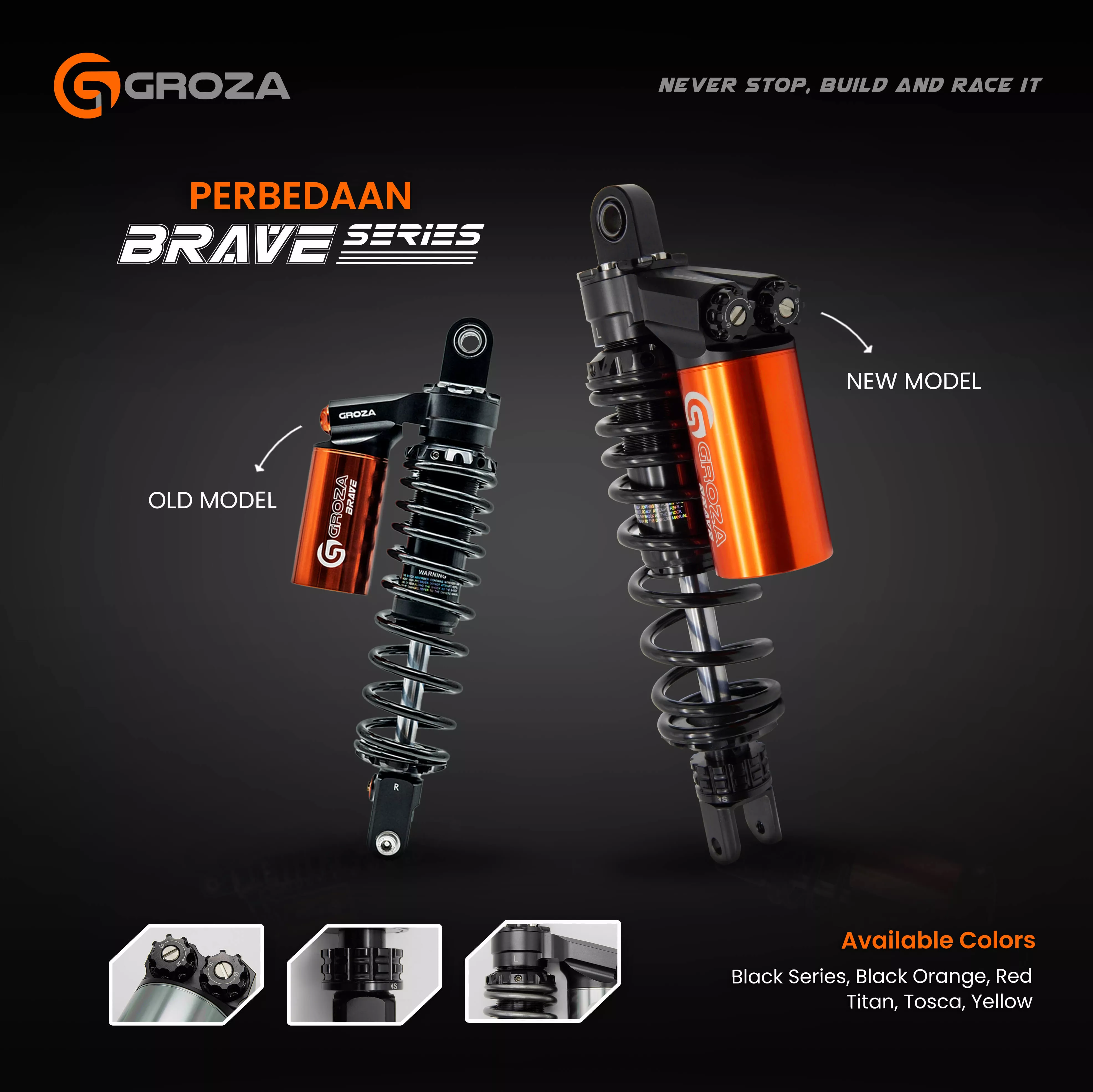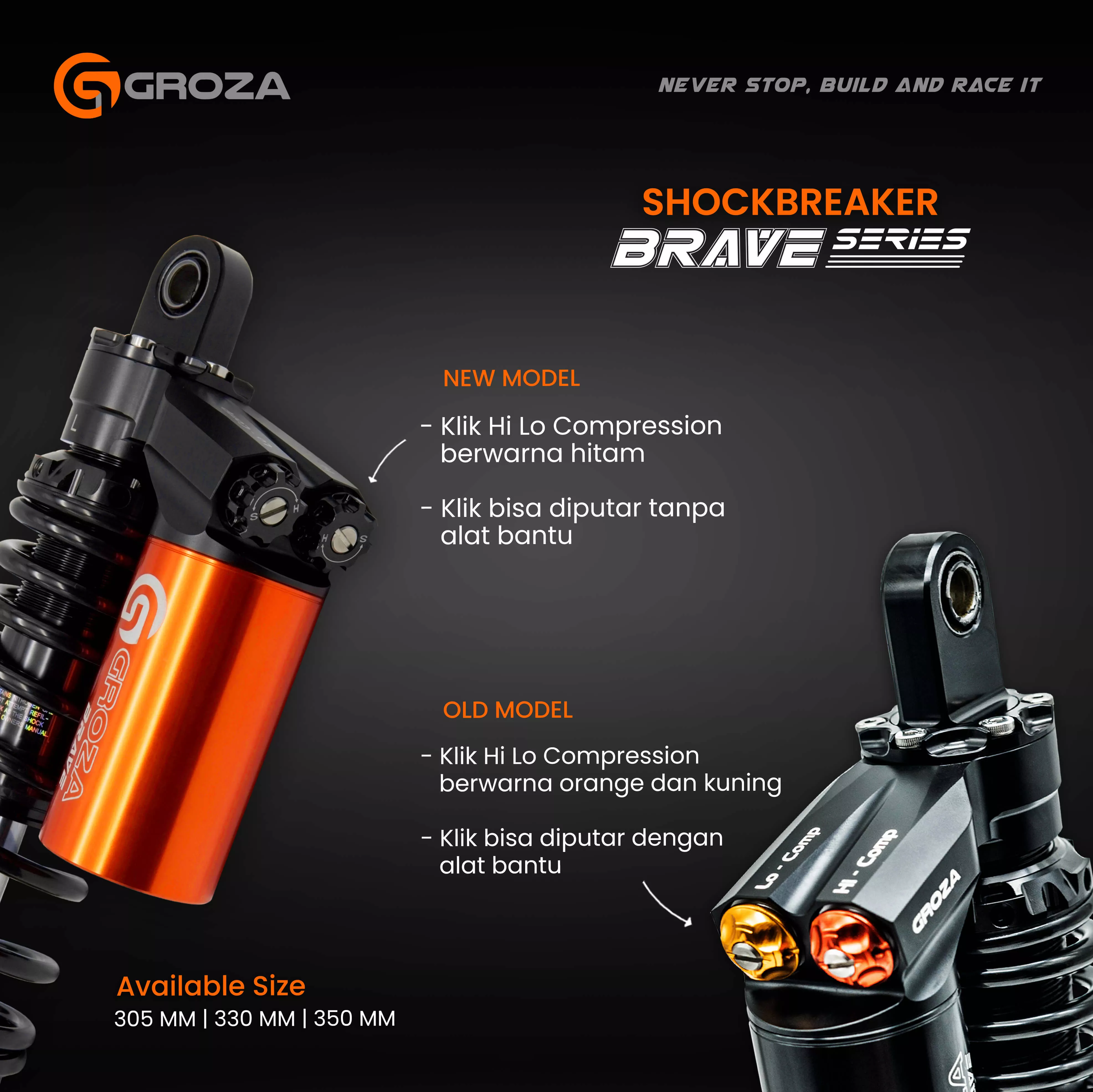 Shockbreaker Brave Series hadir dengan fitur lengkap, yaitu Hi-Low Speed Compression yang adjustable, Preload and Rebound Adjuster. Pengaturan lengkap seperti ini akan bantu kamu untuk sesuaikan karakter suspensi, dengan gaya berkendara kamu!